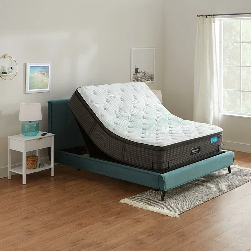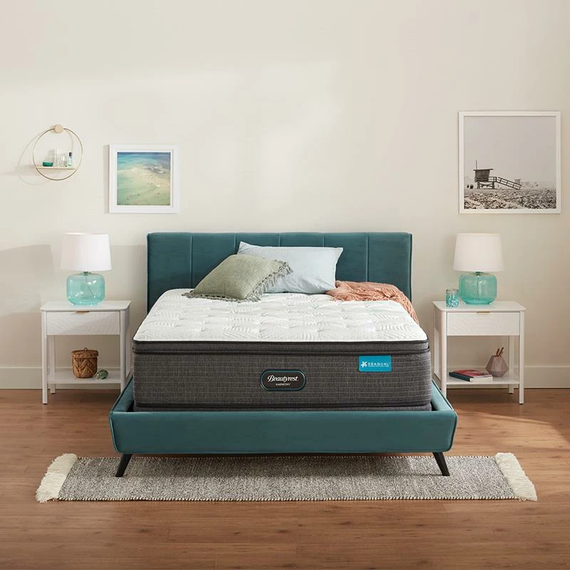The Beautyrest Harmony Kauai Plush Pillow Top features an additional 2-inch pillow top layer for enhanced comfort. Our Targeted Support System powered by T1 Pocketed Coilยฎ Technology provides additional support where you need it most. New NaturalCoolโข features TENCEL fabric and wicks away moisture to keep your mattress fresh and cool, while Beautyrest Gel Memory Foam provides exceptional comfort. The Kauai also features exclusive sustainable fabric technology in partnership with SEAQUALโข, recovering the equivalent of 15 water bottles from our oceans for each queen-sized mattress. Our plush pillow top model provides a softer initial feel, without sacrificing the support your body needs. Exclusive to Mattress Warehouse, the Kauai also comes with our ELS – Enhanced Lumbar Support – system.