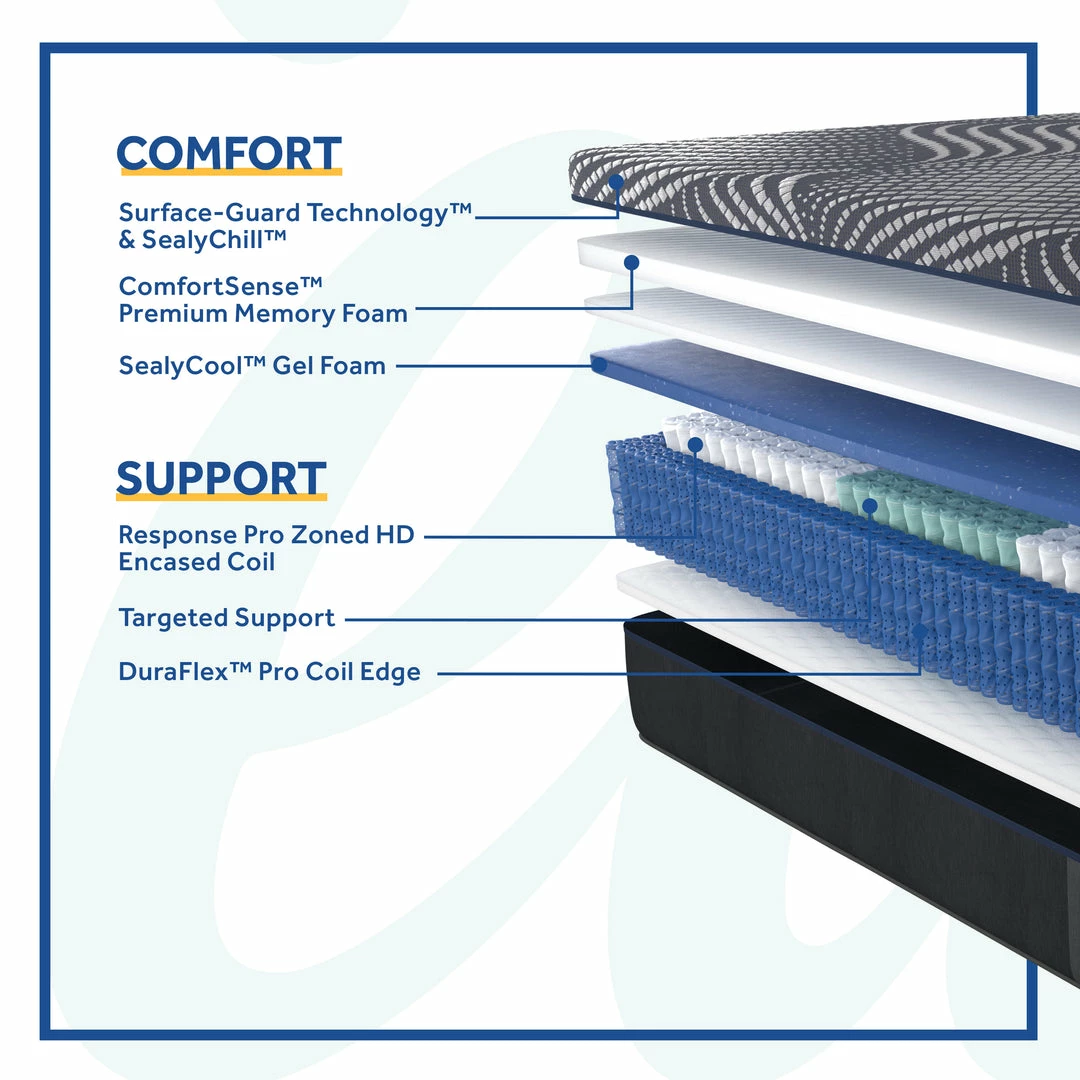- COOLING FOAM: SealyCool™ Gel Foam promotes a cooling environment and helps cushion, delivering comfort and support with a soft feel.